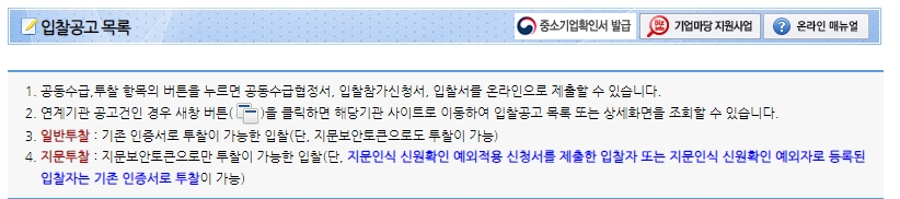 입찰공고 목록 상단에는 공동수급, 투찰 항목의 버튼이 있으며, 이를 통해 공동수급협정서, 입찰참가신청서, 입찰서를 온라인으로 제출할 수 있습니다. 연계기관 공고건의 경우, 새창 버튼을 클릭하면 해당 기관 사이트로 이동하여 입찰공고 목록이나 상세화면을 조회할 수 있습니다.