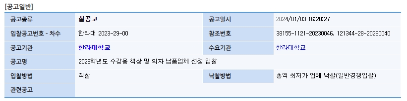 의자로 검색한 결과, 해당하는 공고들이 나타납니다. 이 중에서 일반, 긴급, 취소, 재입찰 등 다양한 분류의 공고를 볼 수 있습니다.