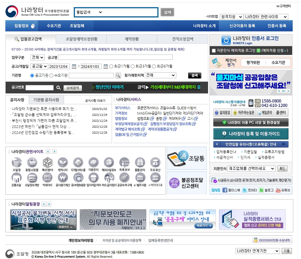 나라장터 홈페이지에 접속합니다. 이 사이트는 조달청이 운영하는 전자조달 시스템으로, 다양한 입찰 정보와 공공기관의 구매 정보를 제공합니다.