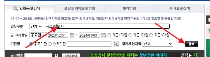 특정 공고를 클릭하면 그에 대한 상세 설명이 나타납니다. 입찰에 참여하고자 하는 경우, 시행령 등 입찰에 관련된 법령 및 공고 내용을 숙지한 후 입찰에 참가하도록 안내되어 있습니다. 조달청은 타 공공기관에서 직접 집행하는 입찰건의 세부내용을 알 수 없으므로, 입찰참가자격 등 세부내용에 대해서는 해당 공고기관에 직접 문의하는 것이 좋습니다.