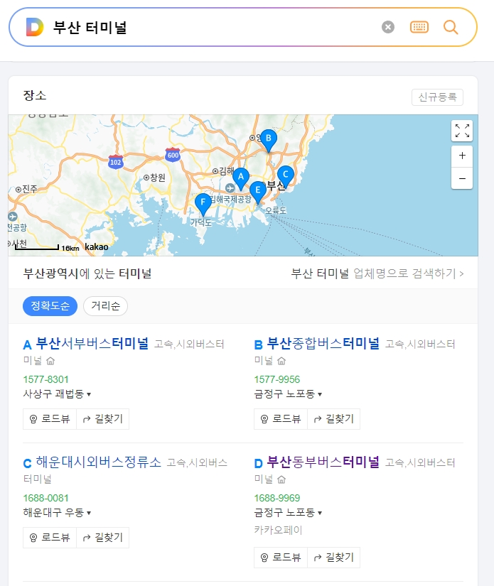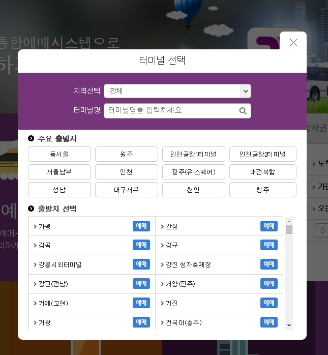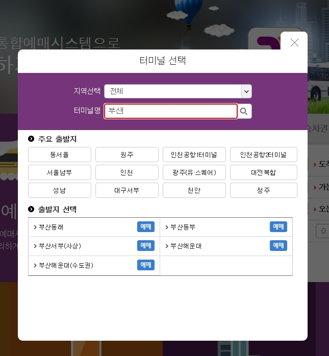 출발지를 검색하는 창에 '부산'이라고 입력해 보세요. 그러면 앞서 말씀드린 서부, 동부, 해운대 등 여러 곳의 터미널 이름이 쭉 나타납니다.